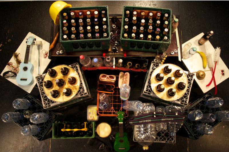 Blasflaschen, Wasserspender-Drums, div. Percussionflaschen, Flachmanninoff (Jägermeister-Xylophon), Zischpulle „Hobby 125“